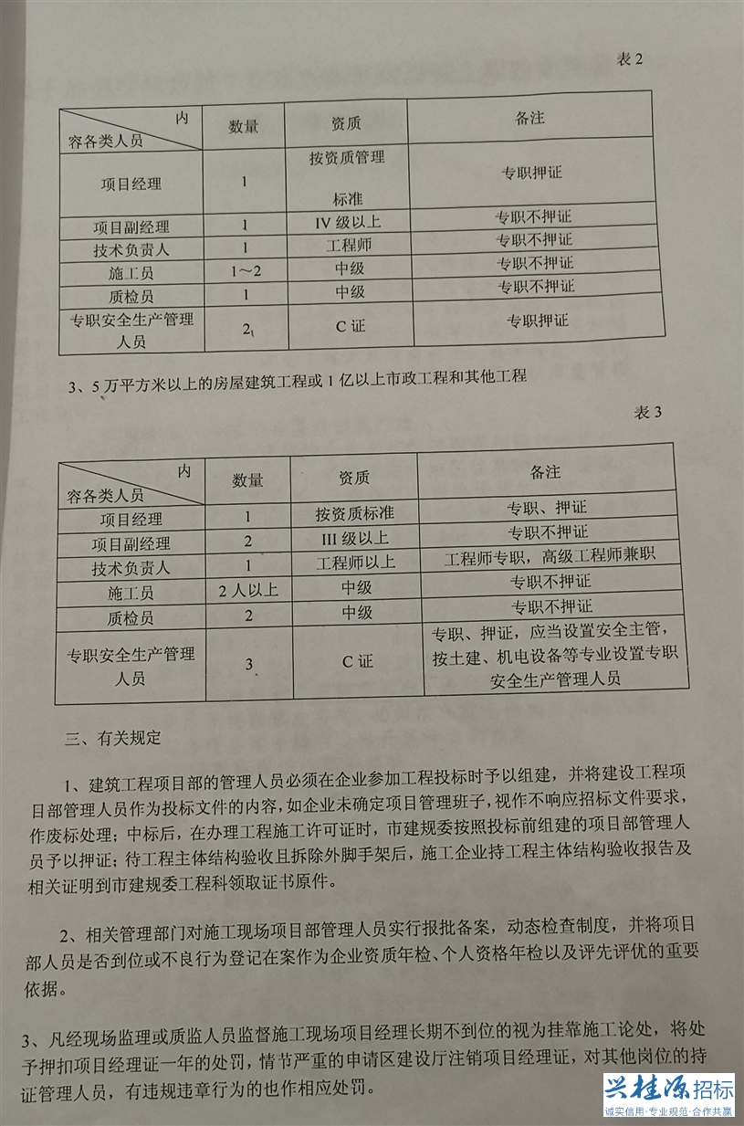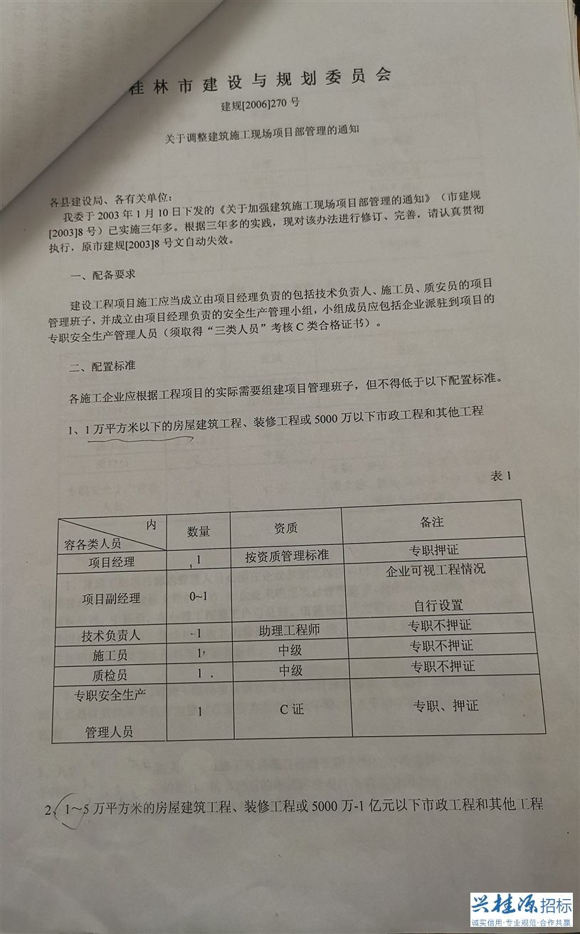 3、桂林建設(shè)與規(guī)劃委員會(huì)建規(guī)【2006】270號《關(guān)于調(diào)整建筑施工現(xiàn)場項(xiàng)目部管理的通知》詳見公告附件1。